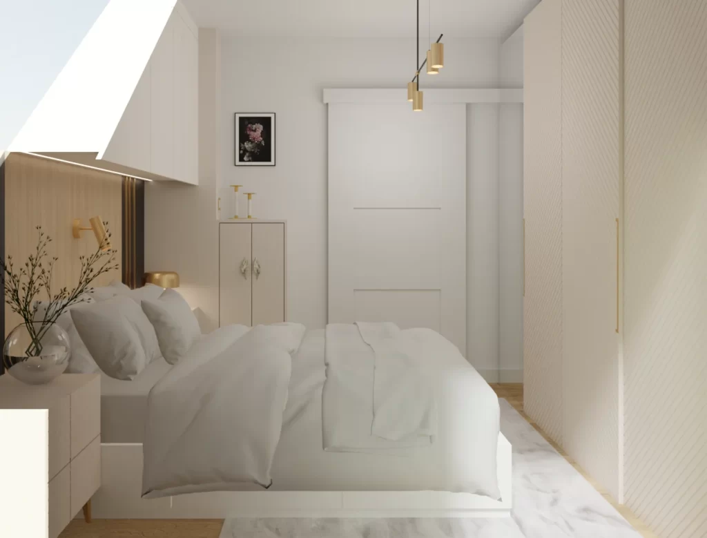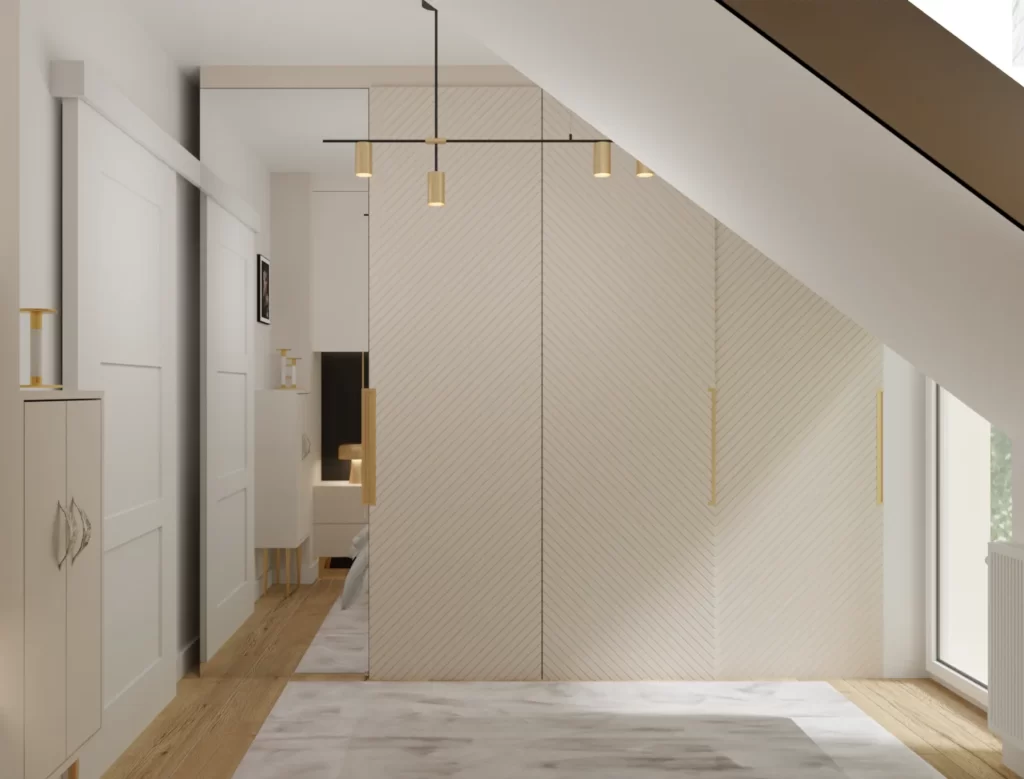 Kobieca sypialnia to oaza spokoju i elegancji. Drewno i odcień kaszmirowy tworzą przytulne otoczenie, a złote akcenty podkreślają subtelny luksus. Przemyślane rozwiązania meblowe gwarantują zarówno funkcjonalność, jak i estetykę.