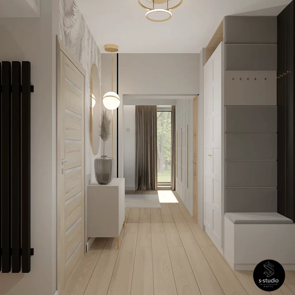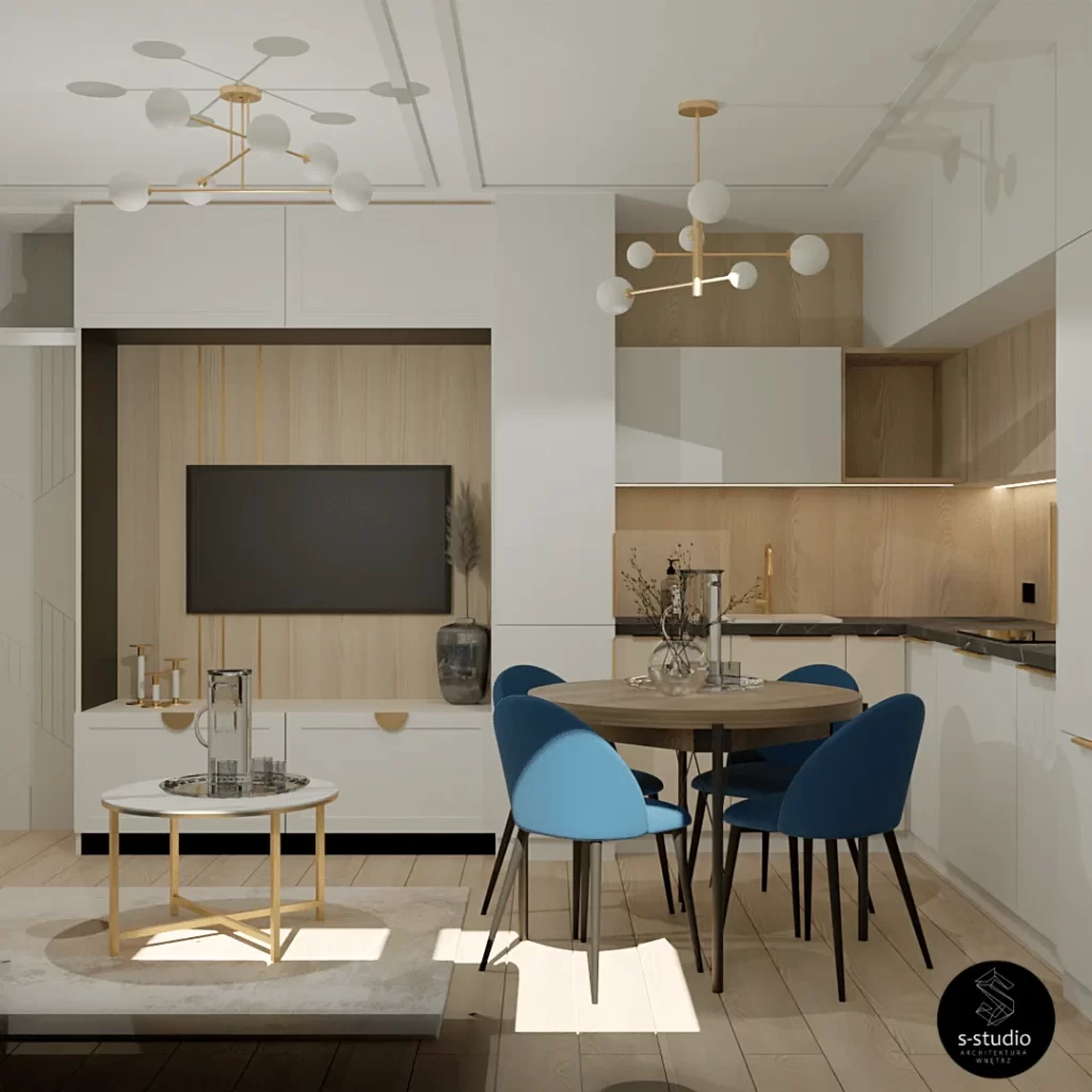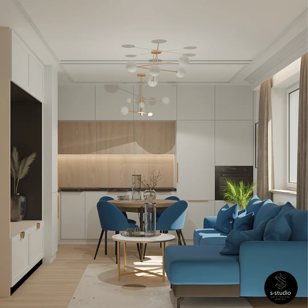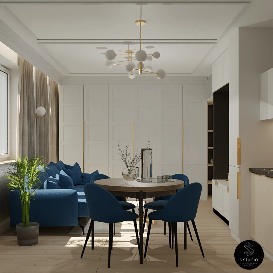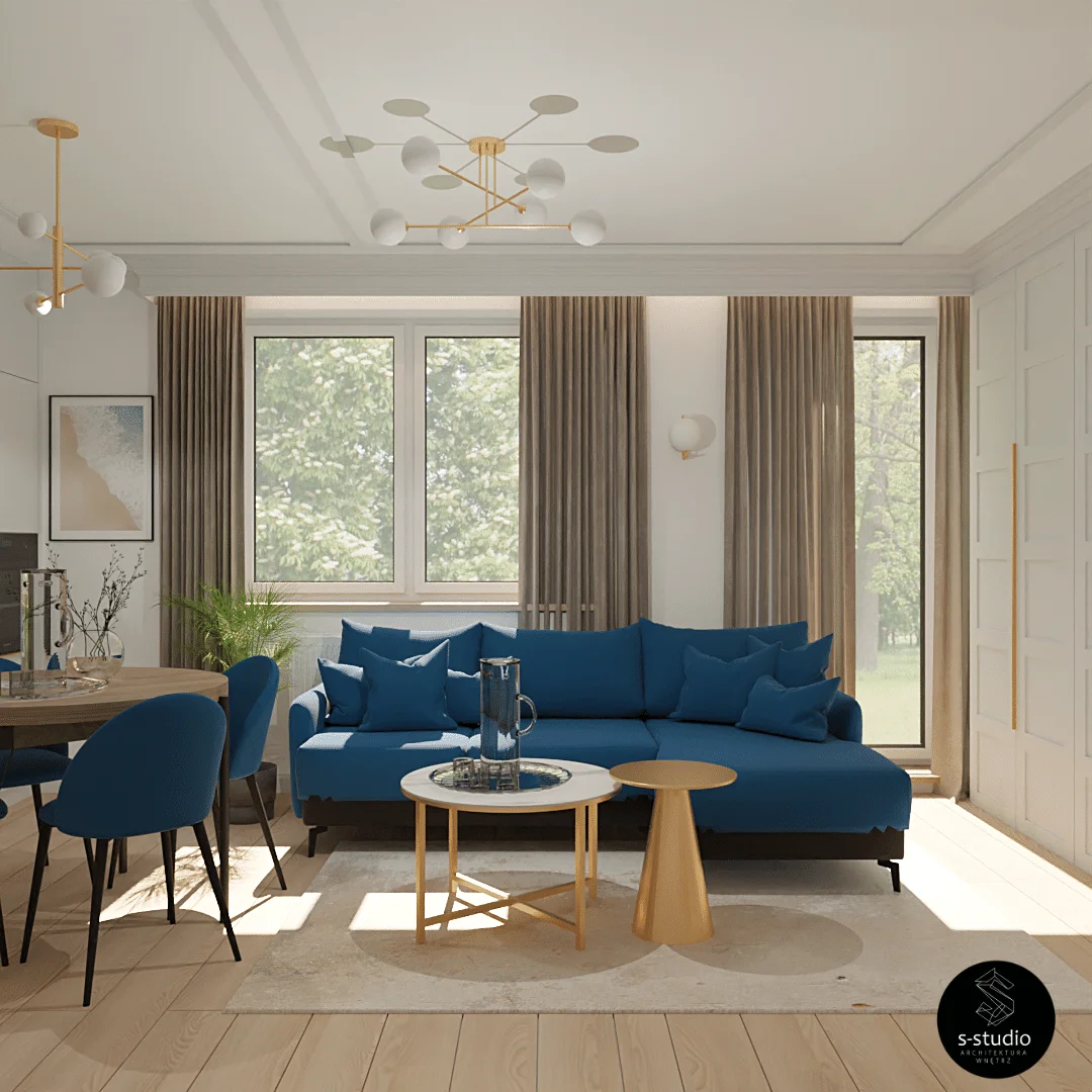 Piekne i komfortowe wnętrza mieszkania klasy premium, łączące niesamowitą estetykę z wyrazistością kolorów. Wykorzystanie kaszmirowych tkanin doskonale współgra z głębokim odcieniem granatu, a całość jest subtelnie podkreślona złotymi akcentami.
